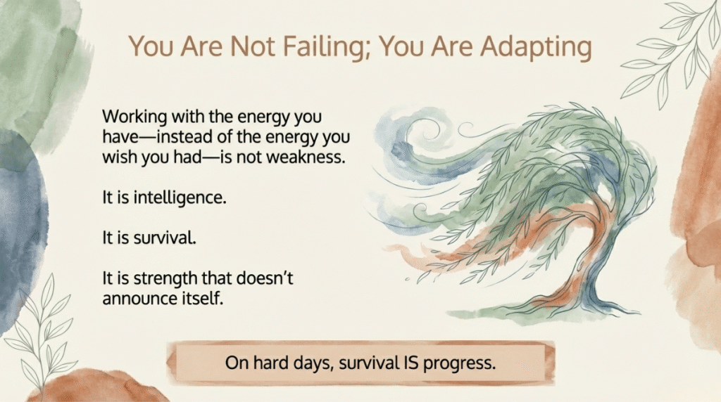 You are not failing because life is heavy right now. You’re not failing because your energy is unpredictable or your mood is low or your plans keep changing. You’re not failing because the wins you’re celebrating don’t look like wins to anyone else.